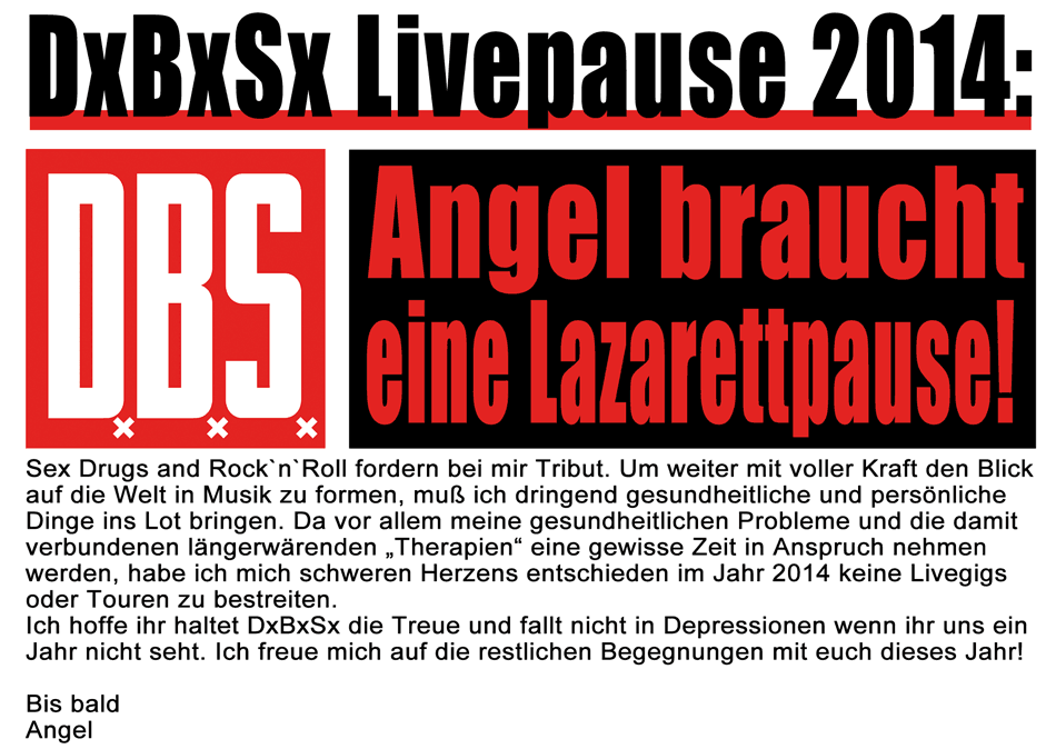 - - - - - - - - - - - - - - - - - - Viele von euch haben es ja schon rumoren gehört: 2014 wird es keine DxBxSx Konzerte geben! Also schaut wo wir im Herbst nochmal aufspielen und kommt vorbei!!! - - - - - - - 06.08.013
