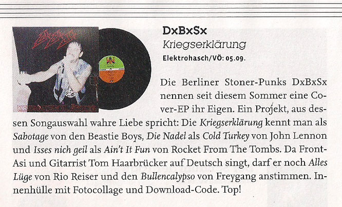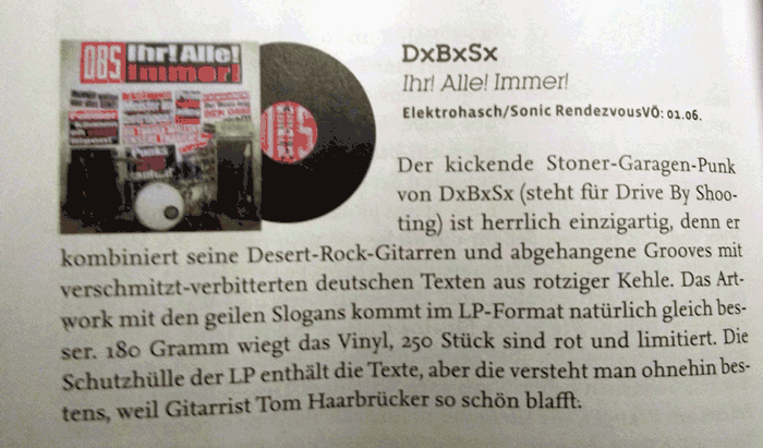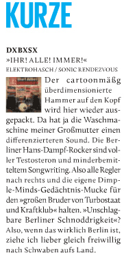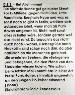 - - - - - - - - - - - - - - - - - - In der bunten Welt der Hochglanzmagazine ist man sich zum Glück auch nich einig. Während die INTRO bei uns "minderbemitteltes Songwriting ... und Dimple Minds Gedächtnis Mucke" hört, empfindet die VISIONS unsere "Desert-Rock Gitarren und abgehangenen Grooves mit verschmitzt-verbitterten deutschen Texten" als "herrlich einzigartig". Im TRUST freut man sich auf "die nächste Runde gut gelaunter Street Rock Attitüde", ROCKTIMES versucht sich im Berliner Idiom und bescheinigt uns "herrlich dreckigen und ungeschminkten Blues Punk Rock" und hat sogar noch ne Kurzkritik zu unserem Hafengeburtstagsgig im Gepäck, während der TERRORVERLAG uns "Schnoddrige Gesellschaftskritik inklusive Brustwarzendrehen und einer ganzen Portion Fusswippmotivation." bescheinigt. - - - - - - - 10.05.013