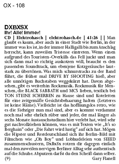 - - - - - - - - - - - - - - - - - - Und noch nen bißchen Nachschlag von der Reviewfront: Das OX überwindet seine Elektrohaschallergie und bescheinigt uns eine weitere Berlinplatte gemacht zu haben. Außerdem war unser Lieblingschris vom AMBOSS MAG war auf der Rotormania und hat einen sehr lesenswerten und mit überschwänglichem Lob nicht sparenden Bericht geschrieben und ne schicke Galerie hochgeladen. - - - - - - - 06.06.013